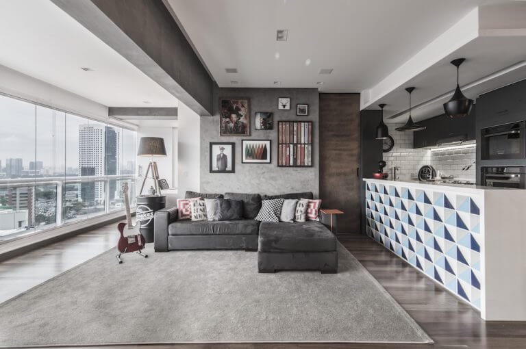 Now, if the objective is to be a little more daring, an interesting option is to leave the walls in shades of gray scale and use stronger colors in the cushions (provided that the sofa also has a neutral color). Remember, using colors can be nice, but always sparingly! In interior design, less is usually more!